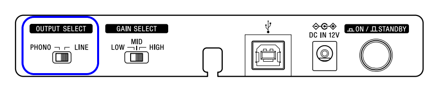 - Use the GAIN SELECT switch to increase the volume from the turntable.