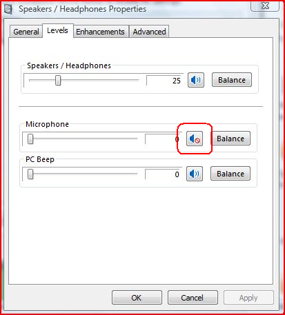 - On the Levels tab, next to Microphone, click on the speaker button [FIG. 1] to enable or disable the microphone.