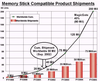 The appearance of Memory Stick media with Memory Select Function and Memory Stick PRO will facilitate adoption of Memory Stick media and compatible products by a broader range of product categories. Cumulative shipments of Memory Stick media including the new generation of Memory Stick are expected to reach 130 million units in 2004 and 210 million in 2005. Cumulative shipments of Memory Stick compatible products are expected to dramatically exceed initial expectations made at the time of the media's market launch; reaching 125 million in 2004 and 200 million in 2005.