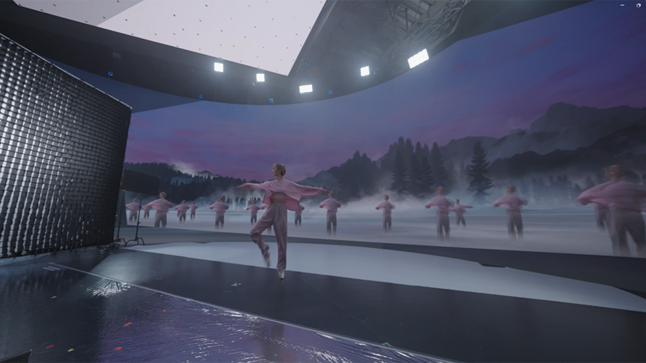 The production was specifically planned in a way to incorporate imaging technology into every element of the performance. For example, in one magical shot (shown above), the camera zooms in on a dancer moving through the fog. Ohga explains, "We aimed to achieve a natural look by switching from a 3D CG dancer filmed with Volumetric Capture to a real dancer dancing in front of LED wall, at the exact moment the camera passes through the morning fog that fills the screen."