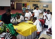 Earlier this year, primary school kids in Nakatsue, located in the southern part of Japan, made three banners to express their support for the Cameroon National Team. The Japanese children decorated half of each banner with cloth cutouts; these half-finished banners were then taken to the Public Viewing in Africa venues where local children who came to watch the matches completed them. The three banners co-created by the children from the two countries have now been divided up, with Cameroon, Nakatsue Primary School, and Sony receiving one each.