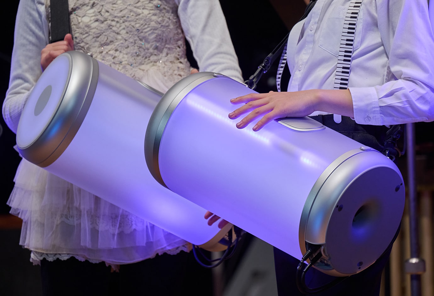 The program began with a performance of "African Blues" by Wolfgang Roggenkamp, arranged for piano, marimba, other percussion, and two sets of the Hug Drum. The Hug Drum make sound and emit light; striking the center of the drum triggers purple light, while edge hits produce green. When you play Hug Drum in pairs, each hit on your drum transmits a vibration to your partner's drum, too. As the performers played the piece, the light cues gave visual expression to sonic differences, creating a dynamic performance that felt like a musical conversation between the Hug Drum themselves.