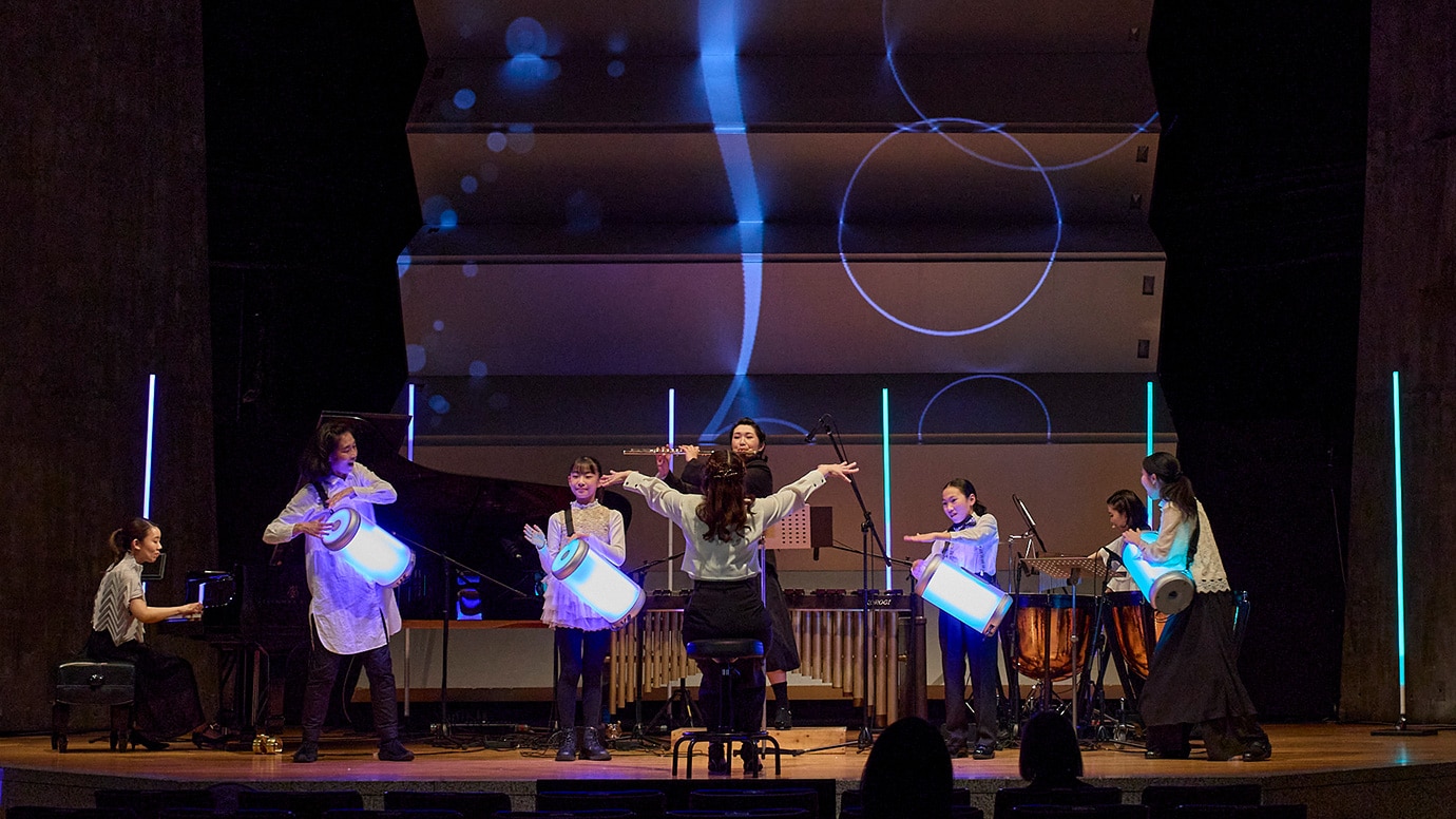Next up was an ensemble of four other performers—people with and without hearing disabilities, adults and children. Splitting into two duos, they played the Hug Drum together while eight LED poles behind pulsed in sync with the instruments, glowing in matching colors. Tokyo Bunka Kaikan's signature accordion-like, sound-reflecting wall panels served as a screen for real-time visualizations of instrumental sounds: graphics representing the tones of piano, flute, and percussion. These lighting and graphics were created specifically for this concert, designed to give people a way to "see" the music.