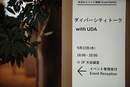 The second part of the event was a panel discussion between people associated with UDA and companies. In the opening remarks, the moderator, Assistant Professor Hiroto Doi of the University of Tsukuba explained the discussion's objectives. Touching on the fact that some people come out when they are at university, only to go back into the closet when they start work, the moderator said the theme of the discussion would be the creation of safe spaces at universities and companies.