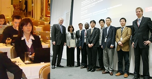 Left: Participated in a meeting held in Munich, Germany, to standardize broadcasting in Europe / Right: At the in-house standardization forum