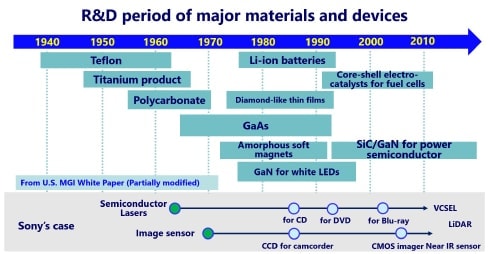 As seen in examples such as Teflon and lithium-ion batteries, the research and development timeline for materials and devices tends to be quite long. This is true at Sony, as well, where research into fields such as semiconductor lasers and image sensors began in the 1970s but has only recently become a specialty at Sony. Materials informatics is a method that is used to streamline and shorten such long research and development processes as much as possible. Also, streamlined and shortened research and development periods are expected to reduce research expenses, leading to environmentally friendly research and development.