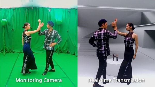 The demonstration was performed in two ways, focusing on a human and a location, separately. In the "human" demonstration, two dancers were captured in the Volumetric Capture studio, and their 3D images were shown in VR/AR applications. In the demonstration of "location," a real set used in a movie was captured and formed into a 3D digital image.