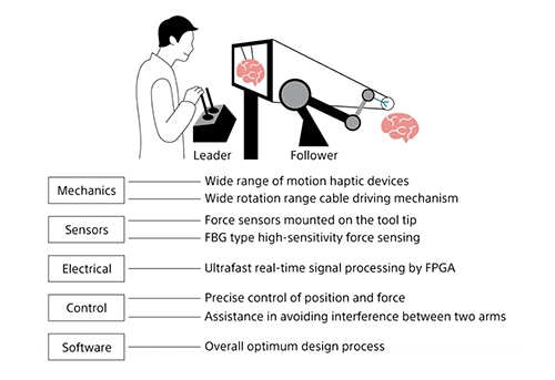 The precision bilateral control system is a robotics technology that enables micro manipulation beyond the limit of human dexterity by integrating multiple different technologies such as precision mechanical design, high-accuracy force sensors and precision acceleration control.
