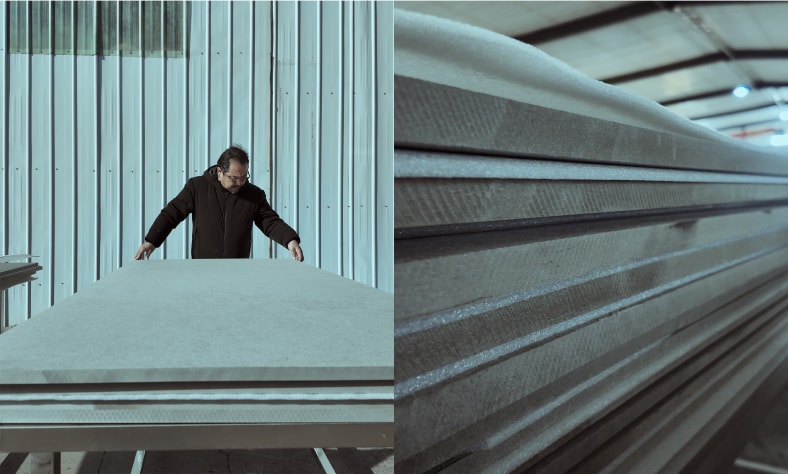 Despite the challenges involved, developing compressed board made of Original Blended Material marked an important step in broadening its impact. Unlike the lightweight, pliant Original Blended Material paper used in packaging, the rigid compressed board needed to support significant weight. At the same time, a plant-based binder was developed and carefully tested to ensure durability. The team was overjoyed when the compressed board met the required standards.