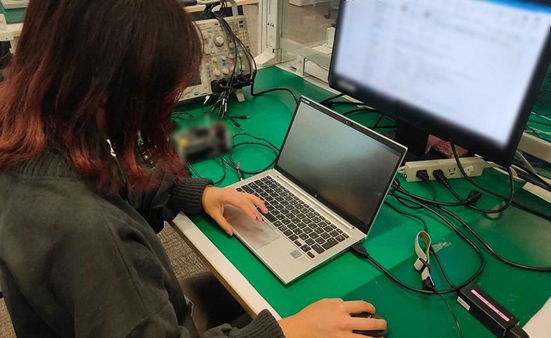 会議のない時間に個人作業を進めます。今日は評価者環境の不具合を解明するため、検査を行いました。どの部分に原因があるか見つけるために、回路のあちこちに端子を当てて、その部分に流れている電流信号の波形を逐一チェックしていきます。
