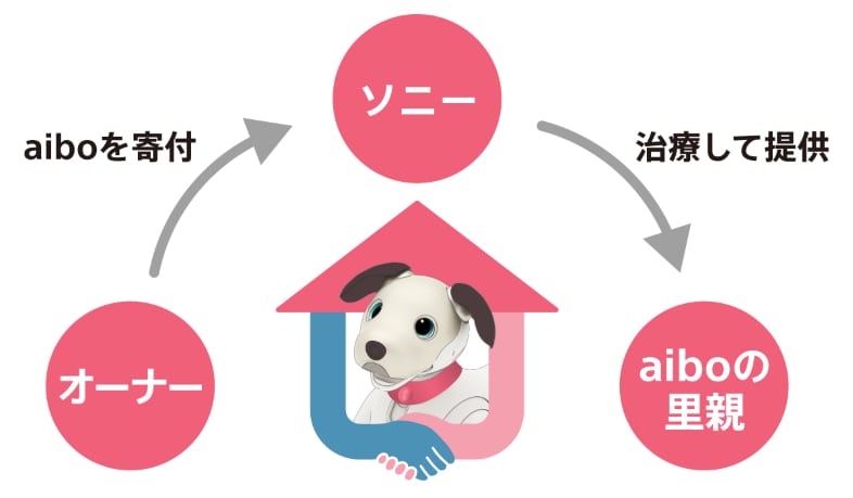 オーナーとの暮らしを終えてaiboベーシックプランが解約されたaibo本体をソニーへ寄付いただくことで、次の活躍の場に繋げていく取り組みです。寄付いただいたaibo本体はソニーが状態確認の後、必要な治療を施した上で医療施設や介護団体など「aiboの里親」に提供します。