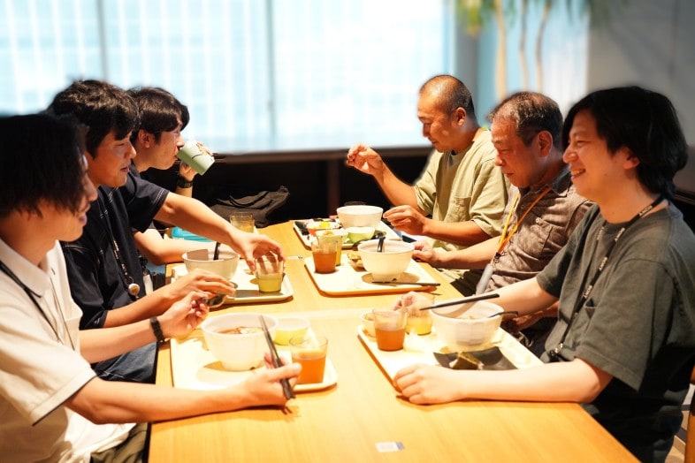 新入社員からベテランまで幅広い年齢層で食事していた5人組の方々にお話を伺いました。皆さん、無線技術のハードウェア設計や開発を担当されているということで、取材時には、私たちが使用している取材撮影用カメラにも興味を持っていたのが印象的です。