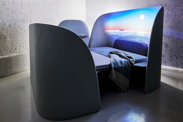 「BYOBU Bed (Concept)」は、ベッドの中にテクノロジーによる心地よい体験が溶け込み、それすらも感じさせないというものを目指しています。ベッドで楽しめるデジタルコンテンツはいずれも自然を想起させるもので、さらに来場者の動きに合わせてリアルタイムで映像や音響が変化するようなインタラクションも取り入れています。また、ベッドに使われるファブリックの質感や寝心地、足の伸ばし方やマットレスのサイズ感、枕の角度に至るまで、ステラワークスさんから学びつつ、体験全体として心地よいものになるように吟味しました。