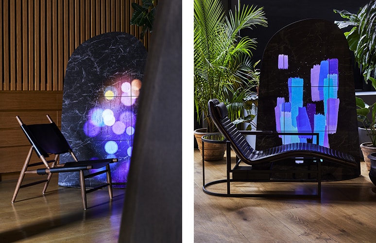 「BYOBU Display(Concept)」は一見、大理石のような仕切りだが、室内にいながらもまるで外の世界をのぞき込んでいるかのような幻想的な体験ができる(写真左)。来場者の動きに合わせて都会的なアートが映し出される(写真右)。ソニー株式会社技術開発研究所と協力して制作された。