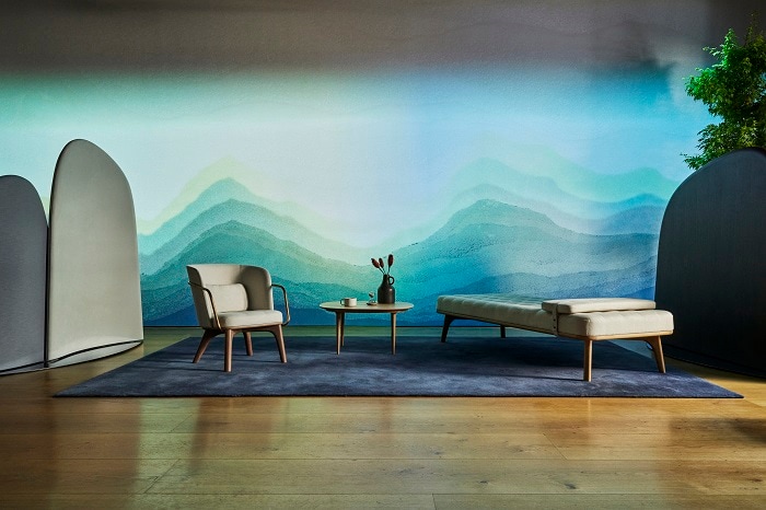 「BYOBU Partition (Concept)」とステラワークスの「エブリデイ」ペンダントライトの演出によって、あたかも鳥の群れが集う大木の下にたたずんでいるかのような安らぎの雰囲気に包まれる。