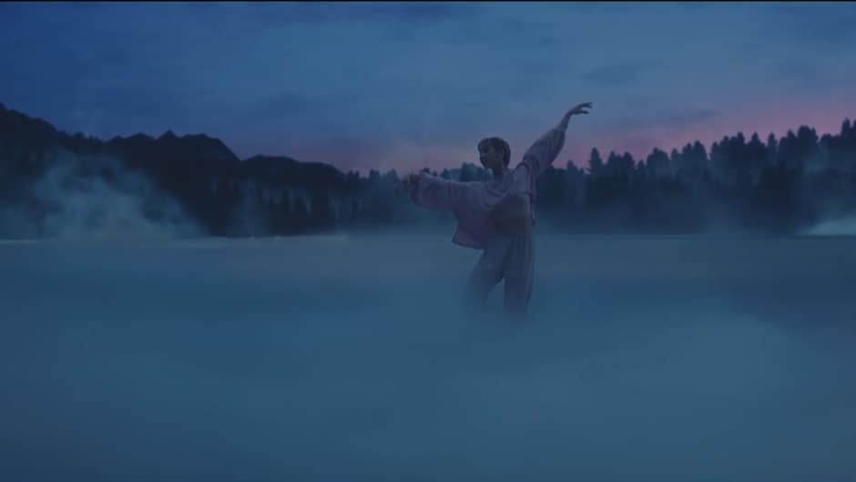 演出の端々で、映像技術を組み込む工夫がこらされています。たとえば、霧の切れ間から一人のダンサーにカメラがズームしていく幻影的なシーン(上の写真)。「画面いっぱいに立ち込める朝霧を抜ける瞬間に、ボリュメトリックキャプチャで撮影し、3次元データ化したCGのダンサーから、LEDディスプレイの前で踊る本物のダンサーに切り替えることで自然な映像表現をめざしました」と大賀は明かします。