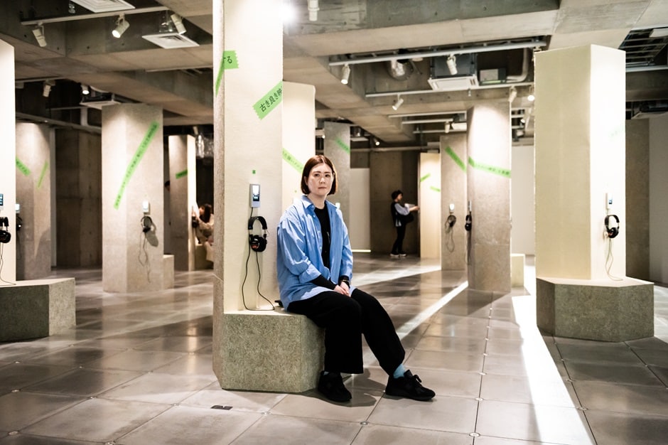 4階にある音楽家の牛尾憲輔と一緒に創った「映画は、森だ。」は、森の木々に見立てた21本の柱にかけられているヘッドホンで、彼がキュレーションした映画のサウンドトラックを聴くことができる展示です。
