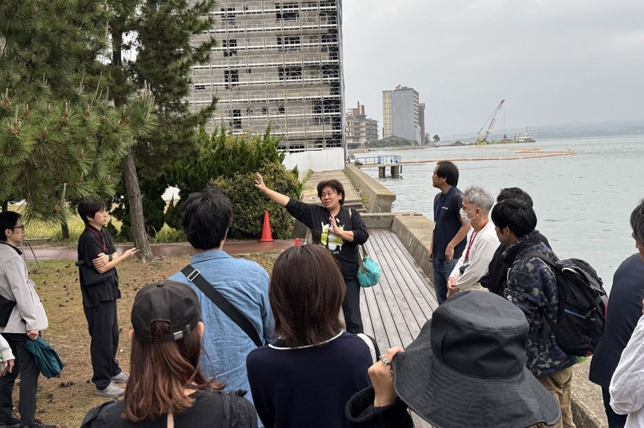 震災の跡地を社員に紹介する御祓川代表取締役の森山奈美氏