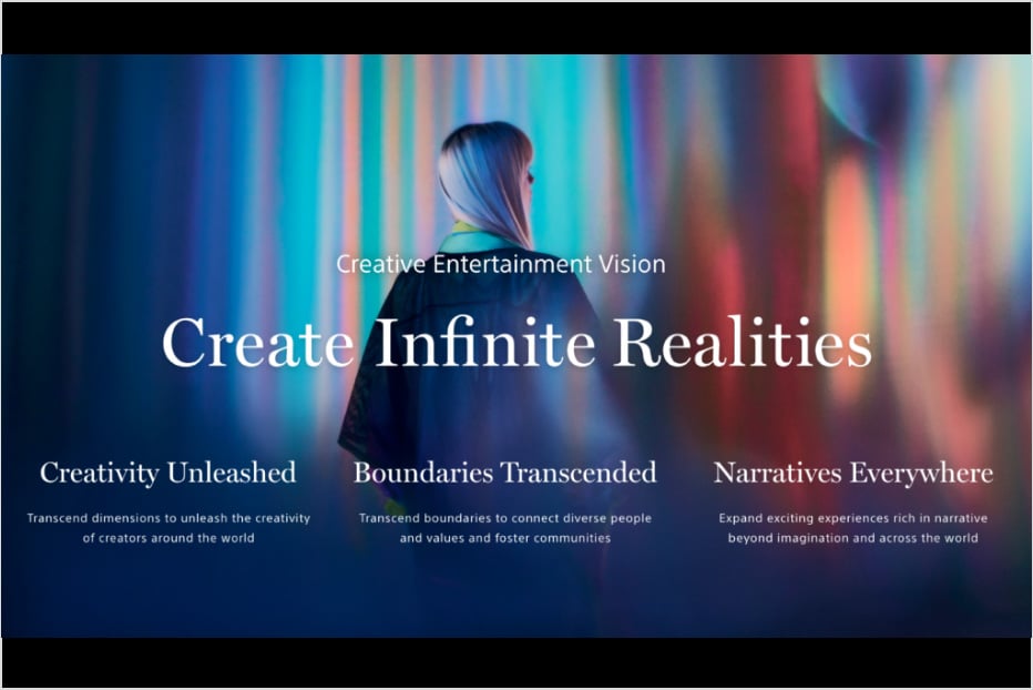 「2024年度経営方針説明会」で発表された、10年後のソニーのありたい姿を描いた長期ビジョン「Creative Entertainment Vision」。フィジカルとバーチャルの境界を超えてクリエイターと共創し、無限の感動を届けていくというソニーの未来の世界観が示されている。このビジョンは、社長 COO 兼 CFO(当時)の十時裕樹と未来を担う世代を中心とする社内外の多様な人材が力を合わせ、2年以上にわたる協働を経て作り上げたものである。多様なバックグラウンドを持つデザイナーも参加し、領域や立場を超えた人々と議論を重ね、クリエイティブエンタテインメントカンパニーとしてのソニーの方向性をデザインの観点から示した。