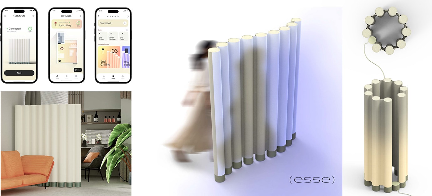 「esse」は、限られた空間やシェアスペースを柔軟に活用できるようデザインされたスマートパーティションです。自動で動くパネルと統合された照明が、空間のレイアウトや雰囲気をユーザーの使い方や気分に応じて調整します。
