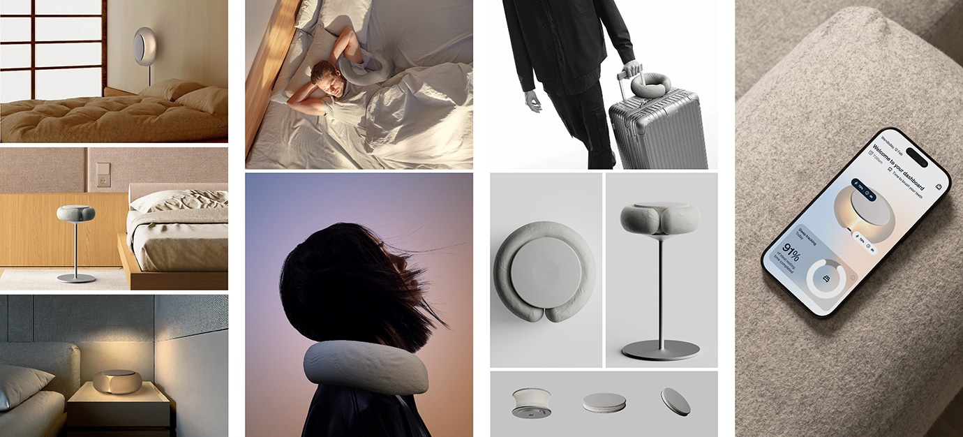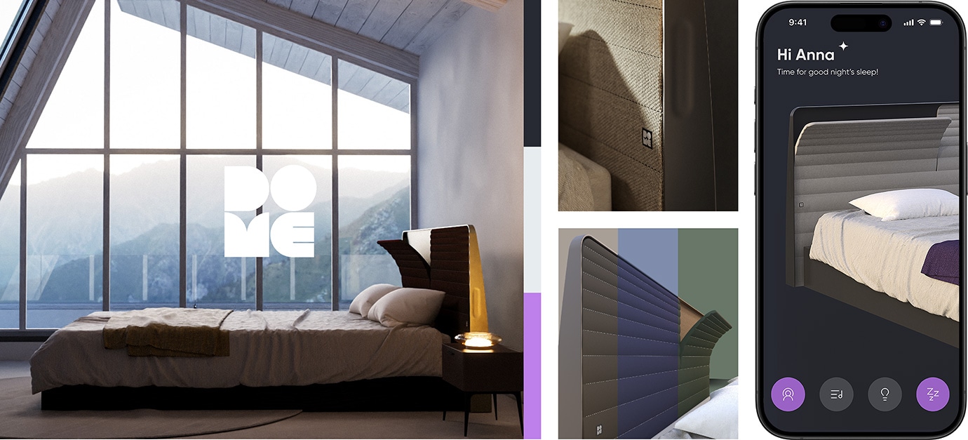 「DOME」は、音響技術と光を組み合わせたスマートヘッドボードです。睡眠時にユーザーの周囲に"バブル(個人空間)"をつくり出し、ノイズリダクションやホワイトサウンド、照明効果によって、睡眠の質を高め、自然な眠りのリズムをサポートします。