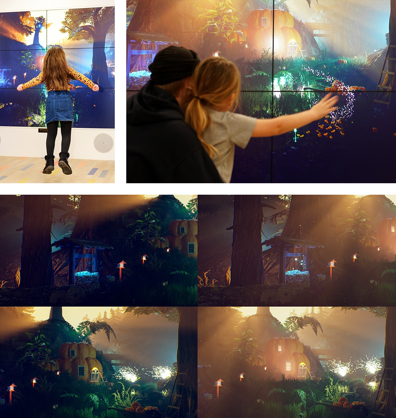 「The Enchanted Forest」は、デザインセンターヨーロッパが制作したインタラクティブな体験型アートです。ディスプレイに映し出された魔法の森では、妖精たちが昼はカボチャなどを収穫して働き、夜は願い井戸で遊んでいます。子どもたちがディスプレイの前に立つと画面上に光として反映され、子どもたちの動きに呼応して森の地面に草花が生えていき、森の探検を楽しめます。光の変化する道筋や沈みゆく夕日が時間の流れを感じさせ、鳥のさえずりや葉っぱの揺れる音が、魔法の世界への没入感を一層高めます。
