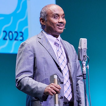 3人目のプレゼンターは、参天製薬株式会社のモハメド アブディンさん。視覚障がい者のアブディンさんは、母国スーダンの障がい者教育・就労支援をサポートする団体の運営にも携わっています。日本では障がい者雇用が増えている一方、採用から1年以内に3割から4割の障がい者が仕事を辞めているデータについて説明しました。原因は複合的で難しいとしながらも、職場の雰囲気や人間関係など、障がい者が働くことへの理解が進んでいない点が大きな課題ではないかと提起しました。また職場の雰囲気と人間関係を改善し、障がいのある人が生きがいを感じて働き続けられる職場にするために、皆で対話をしてお互いを知ることが必要だと述べました。対話をするときに、障がい者の立場から、皆に理解してほしいことは2つ。1つは、障がい者である以前に、まず一人の人として見てほしいということ。認められたい、成長したい、自分の家族を幸せにしたいのは同じなので、一人の人として理解してほしいこと。もう1つは、障がい者が働く上で本当に必要な配慮をしてほしいということ。たとえば、視覚障がい者は会議でプリントを配られても、内容がわからず会議に参加できないが、事前にデータを共有されれば、音声読み上げソフトで確認して会議に臨むことができる。「本当に必要なことについてきちんと対話ができれば、例として挙げたデータのように4割の障がい者が離職せずに済むかもしれません。それどころか、職場の全員がお互いに向き合って、皆にとってハッピーな職場環境ができます。一に対話、二に対話、三に対話だと思います」と述べました。