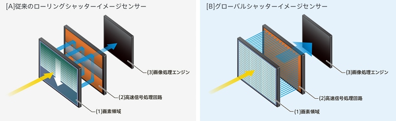 貝沼:デジタルカメラに搭載されるイメージセンサーにはローリングシャッター方式とグローバルシャッター方式の2種類があります。ローリングシャッター方式は、イメージセンサーの受光面の画素を上部から1ラインずつ露光・読み出して処理するのに対し、グローバルシャッター方式は全画素を同時に露光・読み出しを行うことができます。