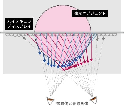 次に(2)リアルタイムでの光線レンダリング技術です。この技術では、はじめにユーザーの位置情報をもとに、表示装置内に被写体が置かれていた場合を想定し、ユーザーがそれを実際に両眼で見ている画像を取得します。次にそれをディスプレイ面上での一種のだまし絵に変換します。これを常に正しく左右の眼に届けるマイクロオプティカルレンズの技術と組み合わせ、実際にディスプレイパネルから出す光源画像として生成します。リアルタイムに作成したこの画像が、ELFDで高精度かつ高速に表示され、常に両眼に正しい視点画像が提示されるので、実際に被写体がそこにあるかのように感じることができるのです。