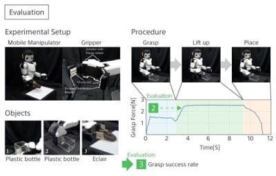 仮説を実証する実験では、コンセプトモデルのマニピュレータが、プラスチックボトルや柔軟でぜい弱な物体の一例であるエクレアを把持できるか確認しました。(図3)