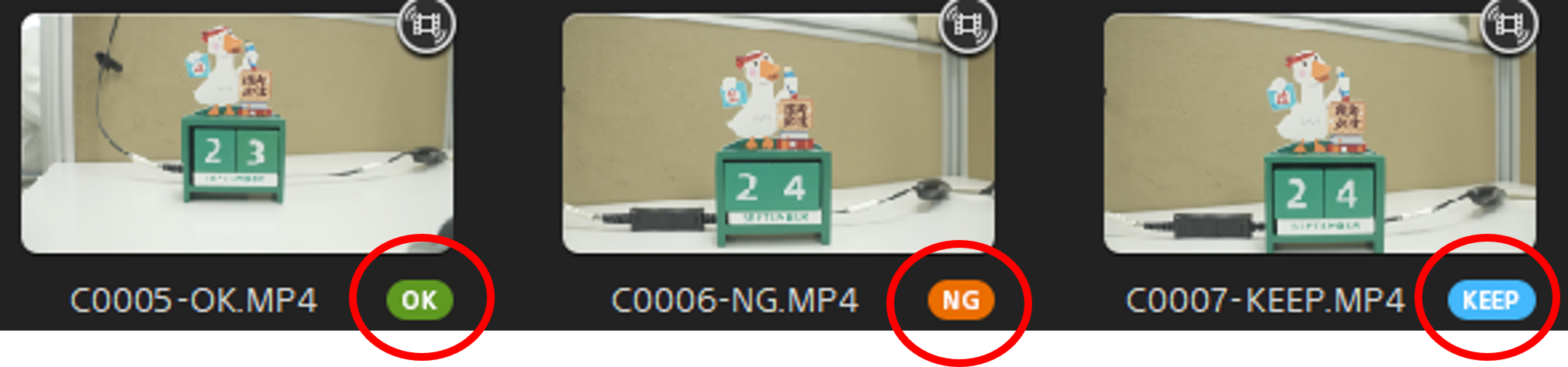 ILME-FX3或ILME-FX30在拍摄动态影像期间或之后,可采用以下三种旗标来标记视频片段:OK/NG/KEEP。这些旗标在后期制作过程中用作选择和编辑的标记。