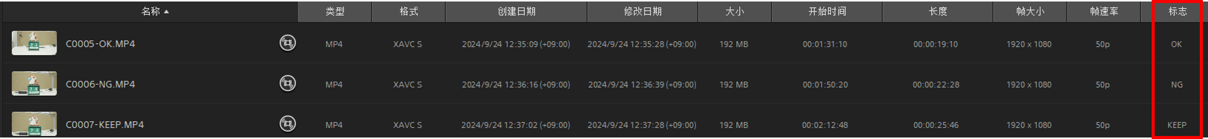 通过Catalyst Browse(CTB或CB)软件可利用标记功能筛选需要的素材。在相机上对素材做好标记后,导入电脑,通过Catalyst Browse(CTB或CB)软件的缩略图模式即可观察到彩色标记(如图),以详细信息模式则可看到文字标记。