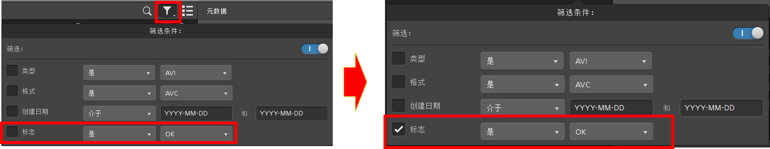 使用筛选,您可以快速找到并选择在拍摄过程中标记为OK 的剪辑,然后复制或转码筛选后的剪辑。