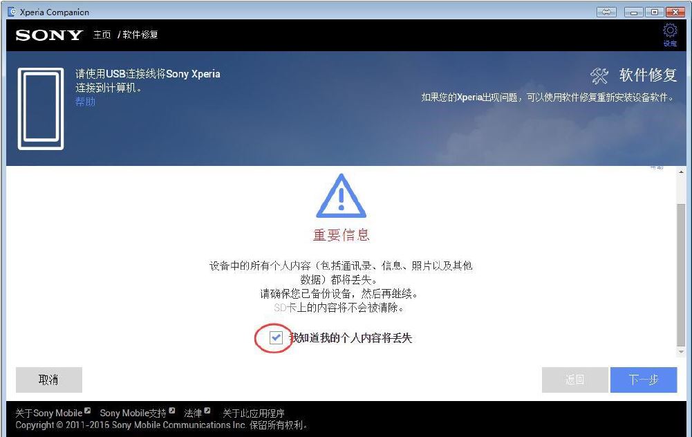 7. 请仔细阅读重要信息 。请注意 :软件修复后 Xperia设备上全部数据都会丢失 (SD卡上的内容将不会被清除 )。并标记我知道我的个人内容将丢失,选择“下一步。