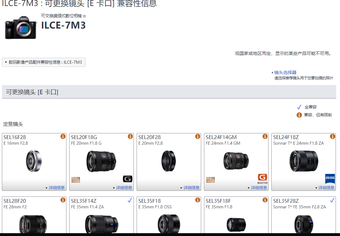 3. 然后所有与ILCE-7M3兼容的镜头都在该页面可以查询。(