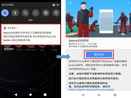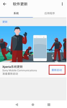 - 如设备检测到新的系统软件,会显示Xperia系统更新,此时点击”重新启动“,手机会重启,重启后自动进行软件更新。