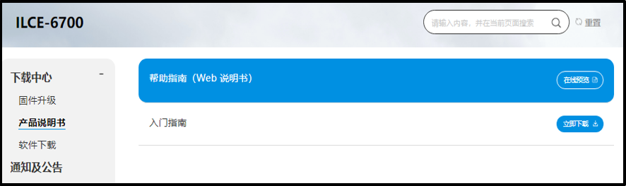 以下内容是以相机 ILCE-6700 为例进行介绍,其他产品的查询方法与之相同,此处不再逐一列举。