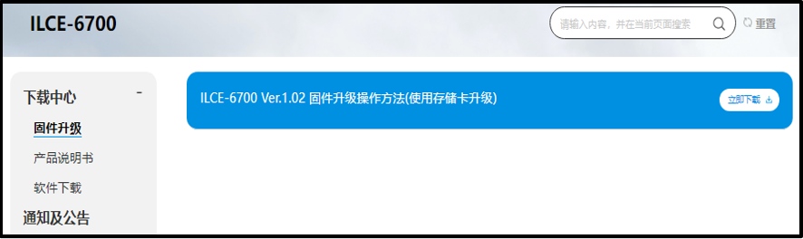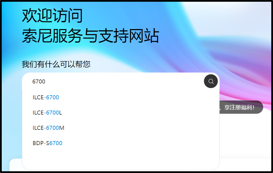 在“搜索框”中输入产品型号"ILCE-6700",然后点击搜索图标或按键盘上的Enter(回车键)。(注意:对于如何确认产品型号可参考文章:如何确认产品的型号与序列号?)