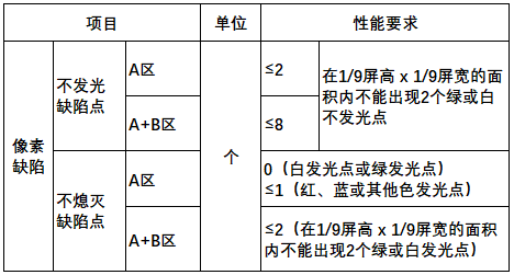 (1)瑕疵点(像素缺陷点、坏点):暗点即不发光点、亮点即不熄灭点,包括白点,有色点。