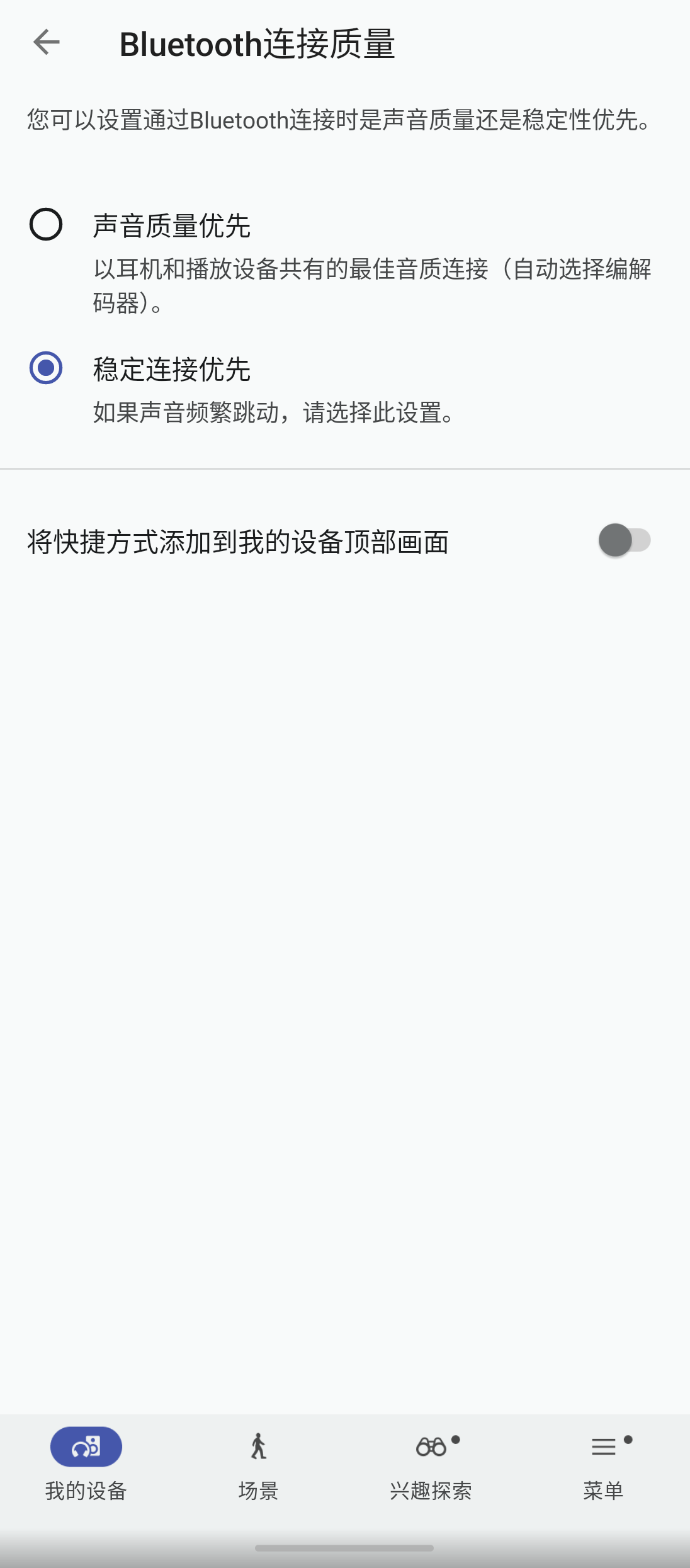 - 当音质较高时,音频处理负载会较大,可能会导致音频跳音。通过更改蓝牙连接质量设置,负载会减少,可能会解决问题。