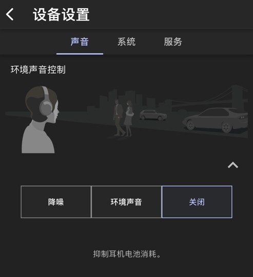 - 在“我的设备”选项卡中,选择 “设备设置”→“声音 ”选项卡,然后点击 “环境声音控制”菜单右侧的向下箭头