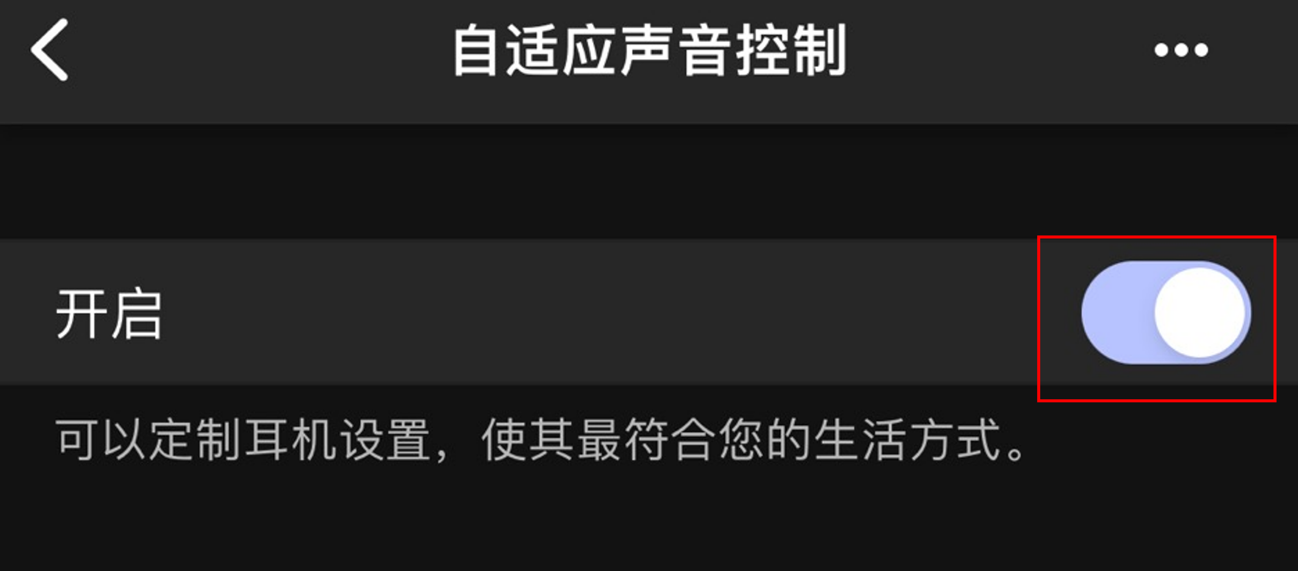 注意: 要禁用通知音,请打开Sony | Sound Connect应用程序,在 “自适应声音控制 ”屏幕中点击右上角的三个点,进入“自适应声音控制设置”并关闭 “通知音”。请按照以下步骤关闭自适应声音控制功能: