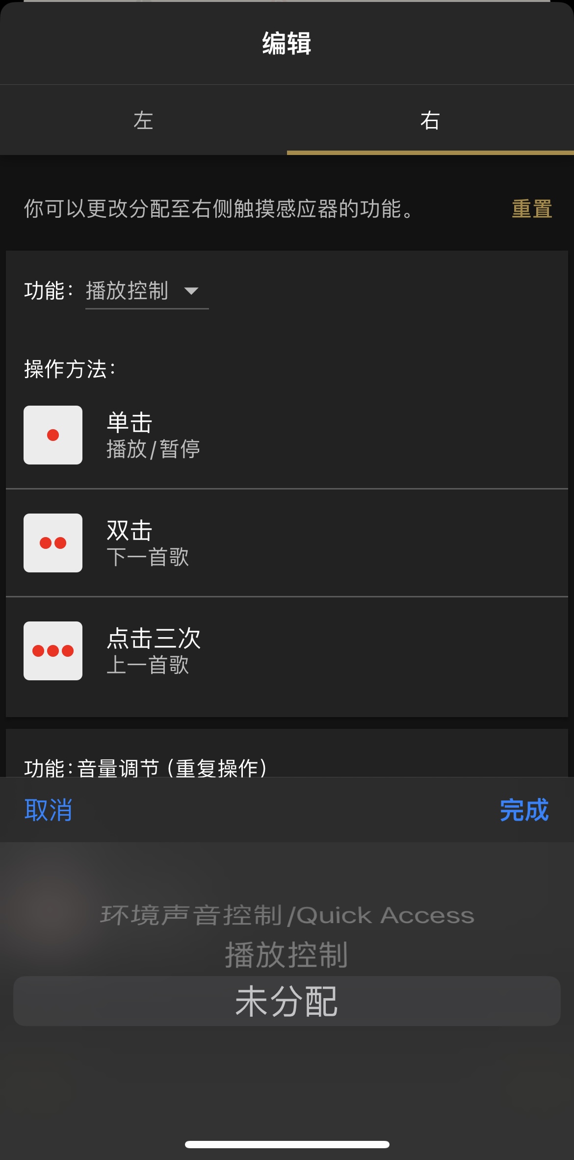 - 如果头发或其他物体可能会碰到触摸传感器并导致其发生反应,您可以在Sound Connect app(原headphones connect)中将传感器的指定功能更改为未指定。