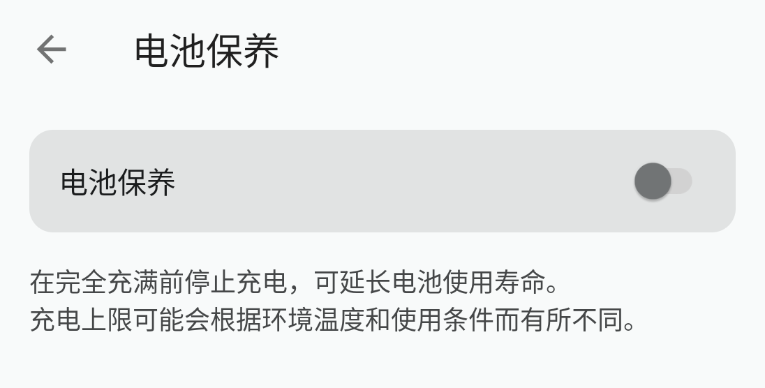 - 点击"电池保养",并将电池保养设置设为"关闭"。